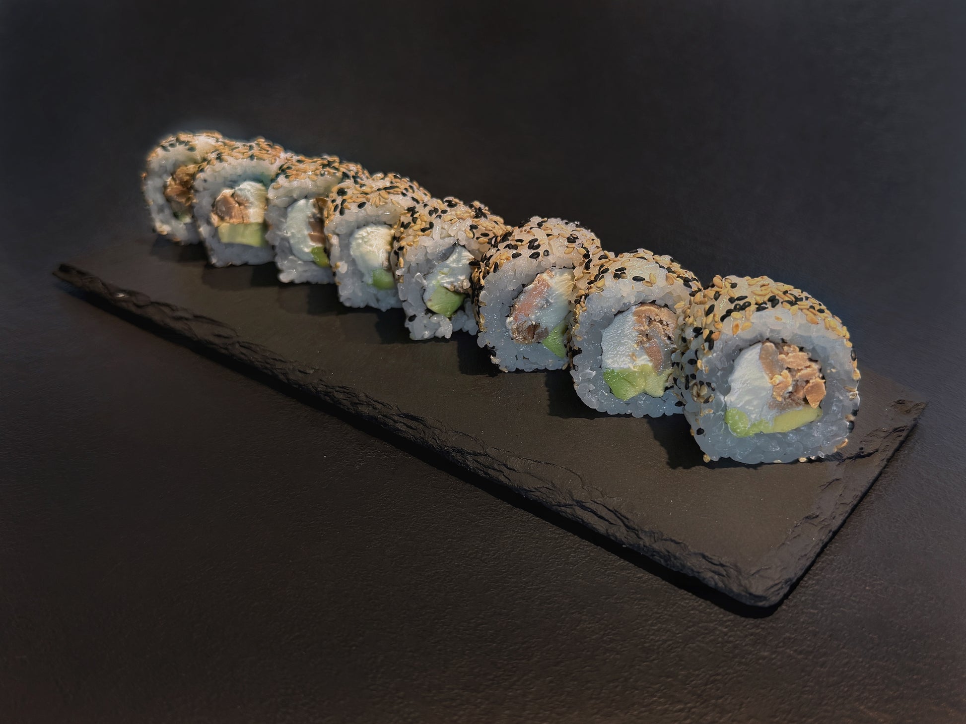 Graines de sésame, riz, saumon frit, avocat, fromage, nori